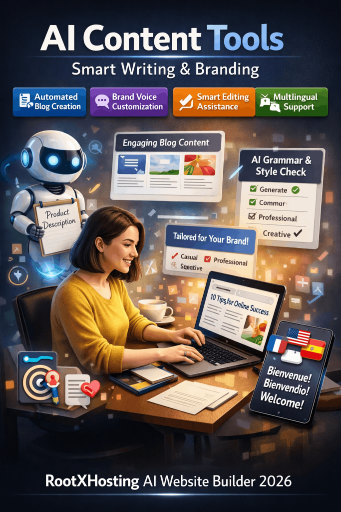 RootXHosting AI Website Builder 2026 isn’t just about building pages; it’s about building a brand voice that resonates with your audience. The integrated AI Content Tools are designed to help businesses and creators craft compelling narratives that drive engagement and trust.